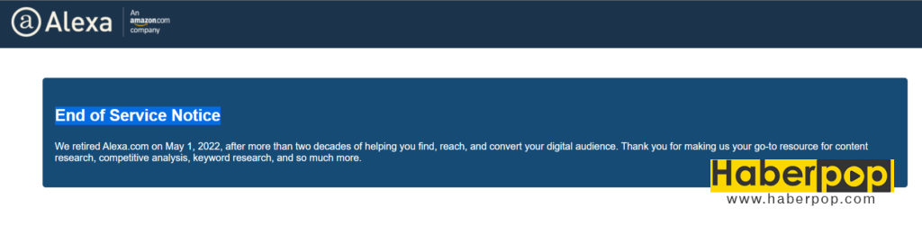 Alexa’nın yaptığı ingilizce (orijinal) açıklama: “We retired Alexa.com on May 1, 2022, after more than two decades of helping you find, reach, and convert your digital audience. Thank you for making us your go-to resource for content research, competitive analysis, keyword research, and so much more.”