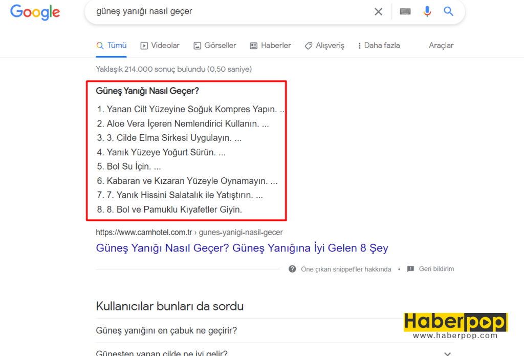 Bu sadece basit bir örnek daha karmaşık sorgularda bile en üstte yine site içlerindeki kendi bulduğu bilgiyi veriyor ve ziyaretçi ile kendisi arasında işi bitiriyor… Örneğin aşağıdaki fotoğraftaki gibi adam “güneş yanığı nasıl geçer” diye arama yapıyor. Google listelemenin en üstüne yine ilgili bir sitenin içindeki değerli bilginin bir kısmını alıp tepeye koyuyor ve diğer içeriklere tıklanma şansını tamamen yok ediyor. Eeee şimdi binlerce içerik üretici “biz daş mı yicez” demez mi… Bence diyor ve google da ne bk yersen ye kardeşim demiş kadar oluyor bu hareketiyle…
