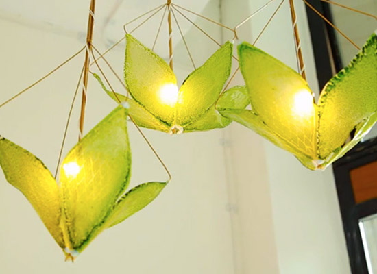 Günlük hayatımızdan tanıyıp sevdiğimiz alelade bitkilerden elde edilmiş kloroplast İpek Yaprak içine asılı halde yerleştirilmiş.